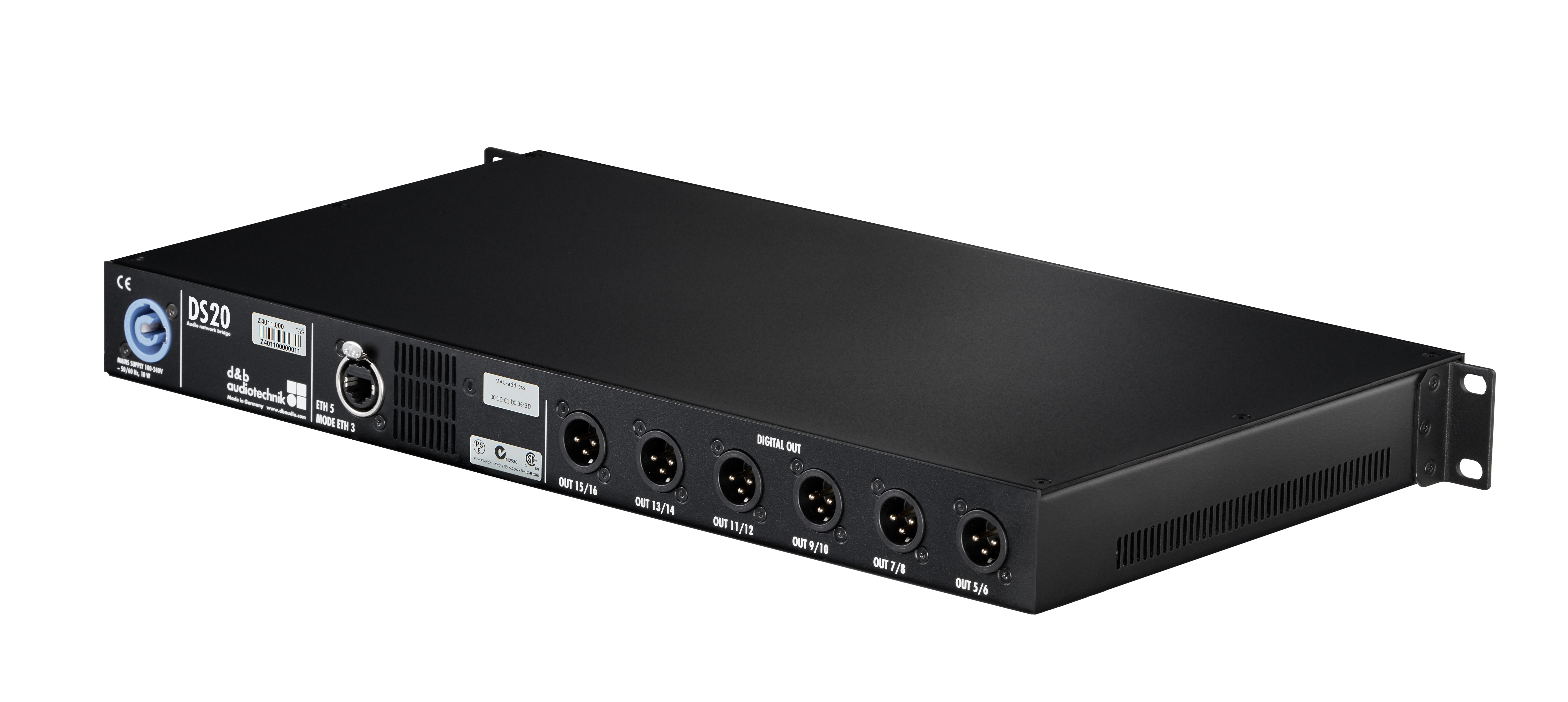 Die DS20 Audio Network Bridge, die sich als Bestandteil eines d&b Systems nahtlos integrieren lässt, dient als Schnittstelle zwischen dem Milan-Netzwerk und digitalen AES3-Audiosignalen. Gleichzeitig können Steuerdaten per Ethernet übertragen werden. Metadaten wie Milan-Kanalkennzeichnungen und Verkabelungsinformationen werden über AES3-Kanalströme an die vierkanaligen d&b Verstärker gesendet.
