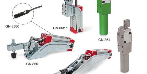 Pneumatische Spanner gehören zu den Standard-Elementen im Vorrichtungsbau, auch Elesa+Ganter hat diese wichtigen Fixierungssysteme seit langem im Portfolio. Nun wurde die Familie überarbeitet, um vor allem die Lebensdauer und die Zuverlässigkeit zu optimieren. Die wichtigste Verbesserung betrifft den Pneumatik-Zylinder, der jetzt mit einem Magnetkolben arbeitet und T-Nuten am Gehäuse bietet. Dank dieser Nut können Sensoren sehr viel einfacher fixiert werden, der Magnetkolben erlaubt wiederum die exaktere Abfrage der momentanen Lage durch den neuen, modernen Sensor GN 3380, der die bisherigen Sensoren komplett ersetzt. Natürlich lassen sich in der Nut auch andere Sensoren exakt anbauen.