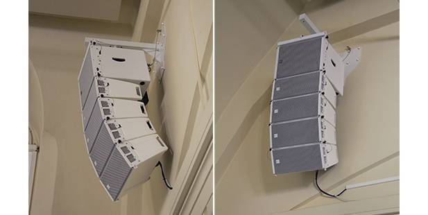 Dazu wurden an der Rückwand des Podiums rechts und links einer bereitstehenden Leinwand kompakte Line-Arrays von RCF hängend angebracht, die den Hörsaal frontal beschallen. Jedes Line Array besteht aus einer Kombination von vier Einheiten aktiver HDL 6-A Lautsprechern, die von zwei geflogenen aktiven HDL 12-AS Subs, die darüber positioniert sind, komplettiert werden. Die HDL 6-A Module sind die kleinsten in der HDL-Modellreihe und werden ebenfalls durch die sehr kompakten HDL 12-AS Bass-Module ergänzt, die sich perfekt in geflogene Line-Arrays integrieren lassen. Alle Komponenten sind in Weiß gehalten, um sich so unauffällig in die Architektur einzugliedern. Das Audio-Konzept und die Installation vor Ort steuerte Andre Scholze und das Unternehmen SEA.