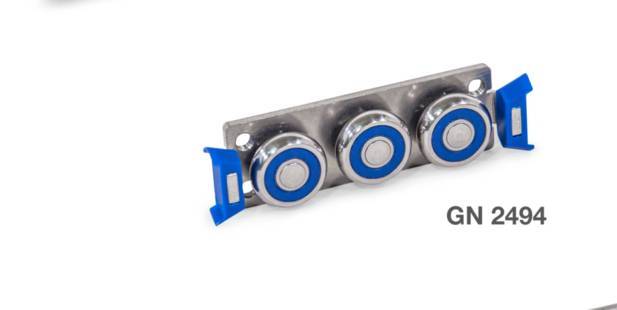 Neu hinzugekommen ist die Edelstahl-Ausführung in den beiden wichtigsten Laufschienenhöhen, 30 und 45 Millimeter. Diese Laufschienen setzen sich aus exakt aufeinander abgestimmten Einzelkomponenten zusammen: aus den Laufschienen GN 2492, den passenden Rollenläufern GN 2494 sowie den separat erhältlichen Abstreifern aus TPU und den einzelnen Rollen mit drei unterschiedlichen Bohrungstypen. Die per Rollenwalzverfahren produzierte Laufschiene ist ausgesprochen stabil und gemäß dem gewohnten Bohrbild montierbar – und das bis zu einer Schienenlänge von 2480 Millimetern. Die kompakten Rollenläufer werden in der C-förmigen Schiene sicher geführt, über die mittlere Rolle lässt sich wie bei Elesa+Ganter üblich das vertikale Spiel justieren. Die Kugellager der Rollen sind abgedichtet, lebensdauergeschmiert und – erkennbar an den blauen Dichtungen – FDA-konform. Damit können diese Laufrollenführungen sowohl in korrosiven Umgebungen genutzt werden wie auch dort, wo strikte Hygienevorgaben einzuhalten sind.