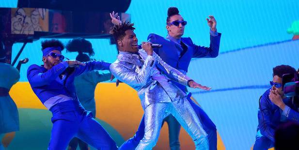 LAS VEGAS, NEVADA – 3. APRIL: Bruno Mars von Silk Sonic bei seinem Bühnenauftritt bei den 64. jährlichen GRAMMY Awards in der MGM Grand Garden Arena am 3.April 2022 in Las Vegas, Nevada. (Foto von Rich Fury/Getty Images für The Recording Academy)