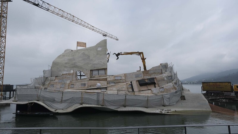 Am Tag nach der letzten See-Aufführung räumten Festspieltechniker die Hinterbühne. Alles musste weg, von den im Bühnenbild versteckten Lautsprechern bis zu den Maskenspiegeln. Zeitgleich schütteten LKWs mitten im See eine Baustraße aus Felsen und Steinen auf, um einen Zugang für die Abbruchgeräte zu schaffen. In nur wenigen Wochen verschwand nicht nur das 300 Tonnen schwere Madame-Butterfly-Bühnenbild, auch vom 45 Jahre alten Betonkern ist nichts mehr übrig. Der Betonkern war die Basis für die jeweiligen Bühnenbilder und als Teil der Hinterbühne ein Ort für alles, was bei einem Spiel auf dem See benötigt wurde.