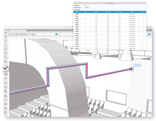 Der Vernetzung von Systemen mit dem ConnectCAD-Modul wurde mit Version 2022 deutlich einfacher. Kabellängen oder Kabelverläufe können jetzt effizient und digital geplant werden. Mit dem überarbeiteten Kabelplanungsmodul lässt sich Verkabelung sowohl in 2D als auch in 3D intelligent konzipieren. Die realitätsnahe Planung der Kabelwege, Kabeltypen oder Kabelmengen im 3D-Modell ist präzise und zeitsparend.