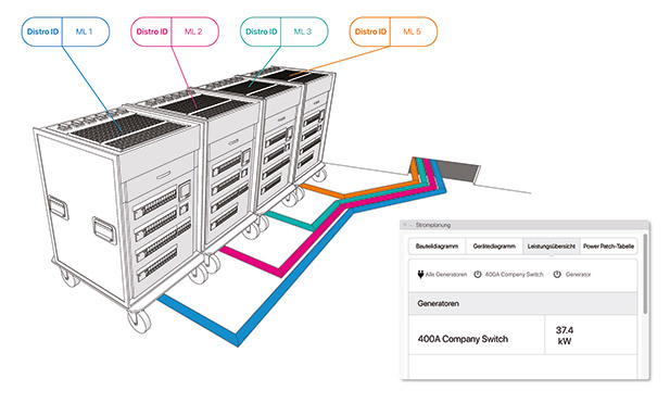 Mit verbesserten Spotlight-Funktionen können jetzt der Kabelpfad und Leistungsbedarf für Veranstaltungen effizient geplant und dokumentiert werden. Inventare, Kabelbaumlisten, Materiallisten, Leistungsübersichtstabellen usw. können einfach direkt in Vectorworks erstellt werden. Kabel zwischen verbundenen Objekten werden automatisch eingefügt und passen sich späteren Änderungen an. Das neue Kabelnavigationssystem zeichnet Kabel, sobald die Ein- und Ausgänge ausgewählt werden.