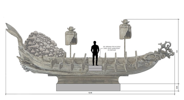 Das zwölf Meter lange Boot wird über einen Schienenstrang in die Bühnenmitte bewegt. Mit reiner Muskelkraft zweier Techniker. Grafik: Winter Art