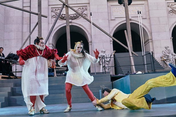 Der Dom im Hintergrund ist eigentlich Kulisse genug – das Podest auf der Bühne, das je nach Szene in den Untergrund verschwindet, schafft jedoch gut durchdachte Effekte. Foto: SF / Matthias Horn