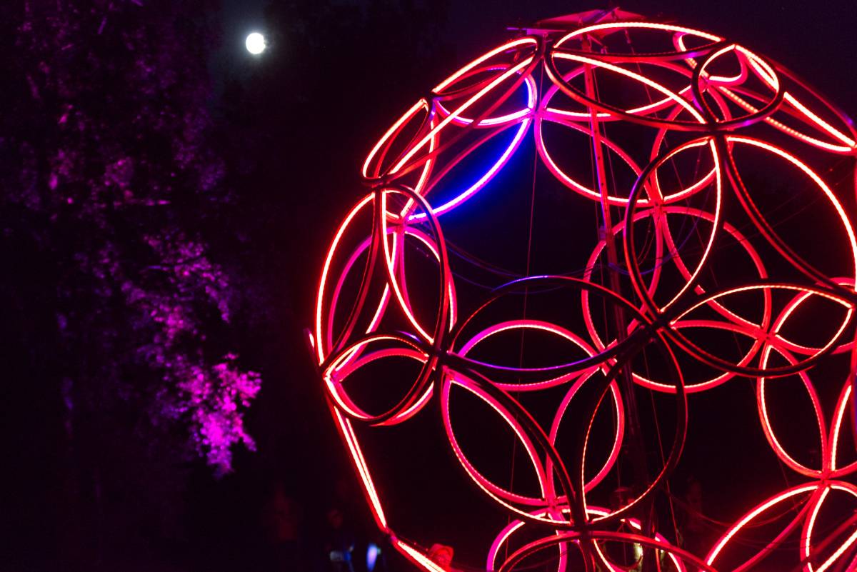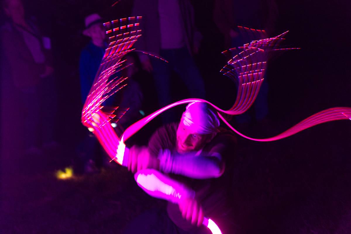 Und so drehten sich LED-Lichtstäbe, Lichtbänder, enorme Kugelgestänge in allen Farben und die Protagonisten selbst mit Bändern und Fahnen. Dazwischen sphärische Klänge und Trompeten-Improvisationen vom – natürlich auch illuminierten – Aussichtsturm.