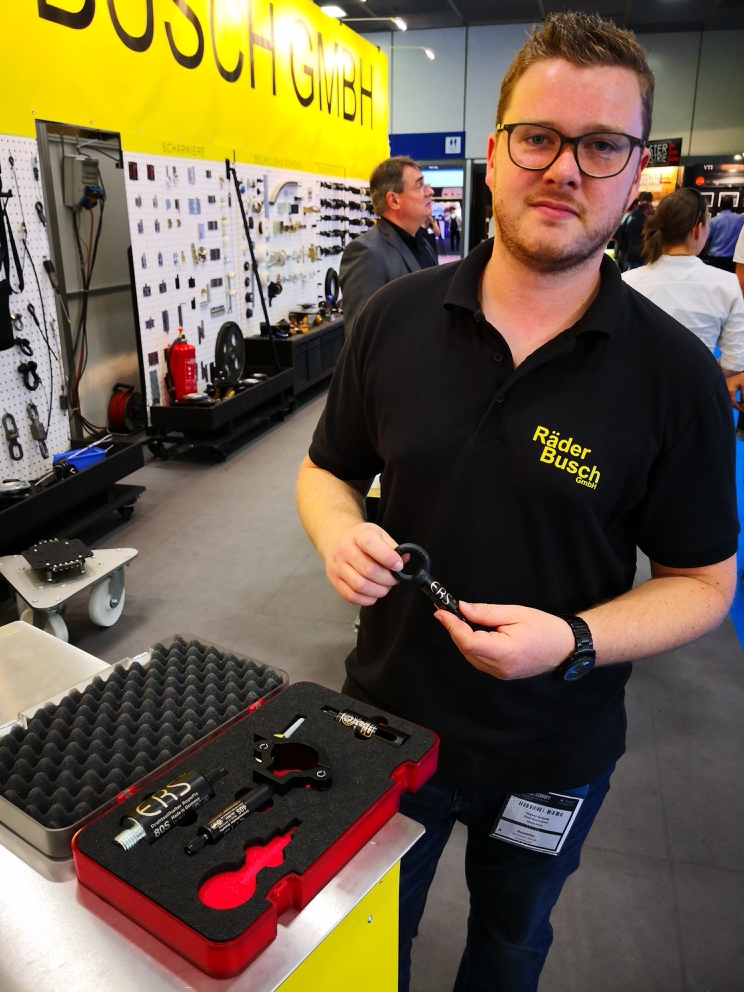 Bei Räder-Busch (Krefeld/D) zeigt uns Kundenberater Thiemo Gosselk die aktuellen Sicherheits-Drahtseilhalter RopeFix40S, 50S und 80S für Seil-Durchmesser von 4, 5, 6 und 8 Millimetern. Ein roter Markierungsring, die Überlastanzeige, schiebt sich aus der Hülse, wenn die maximale Zugkraft erreicht ist. In diesem Fall muss das Bauteil ersetzt werden. Eine Spannzange dient als 2. Sicherheitsstufe, die bewährte 3-Kugel-Mechanik sichert im Bereich der Arbeitslast. www.raeder-busch.de